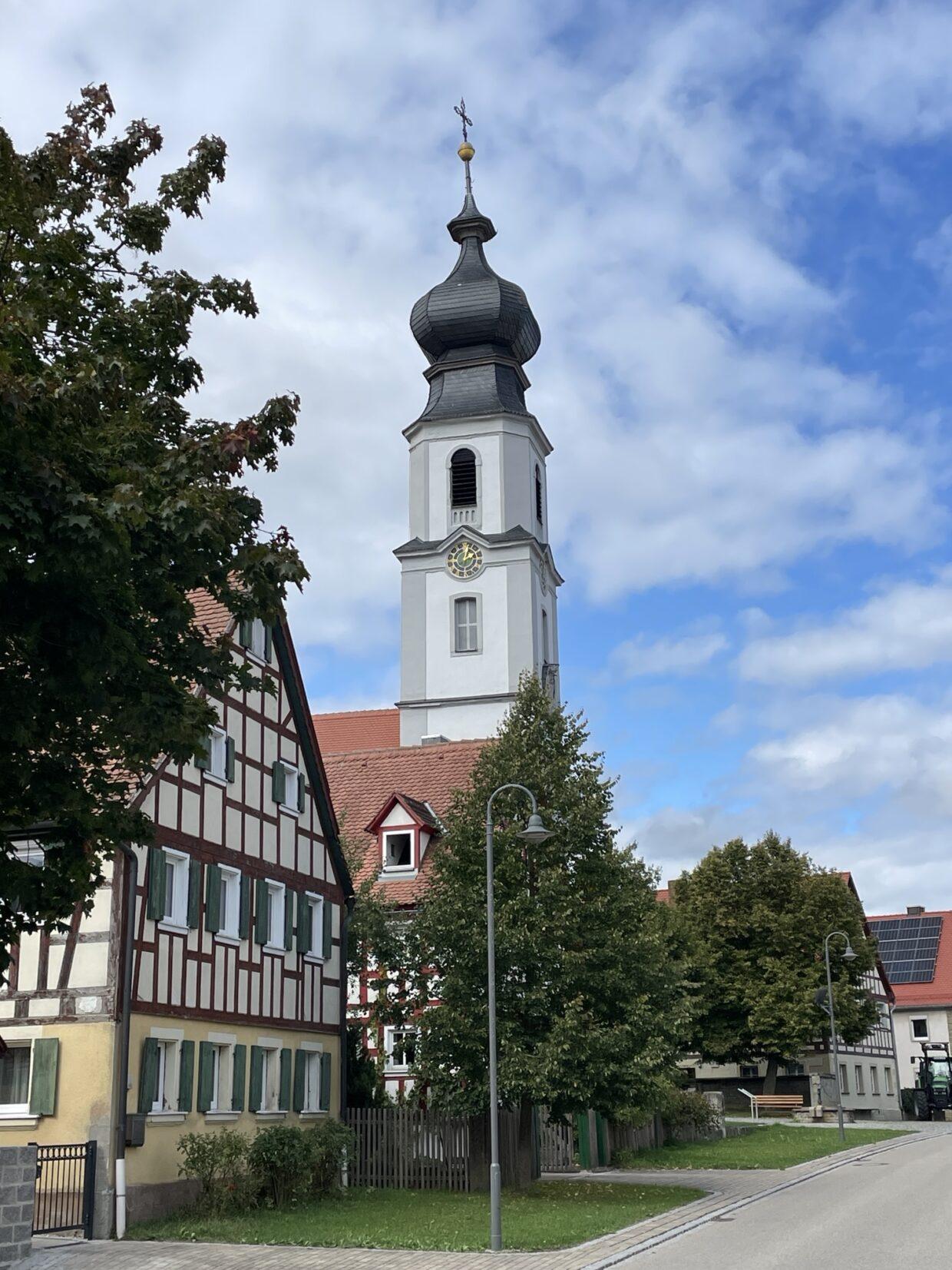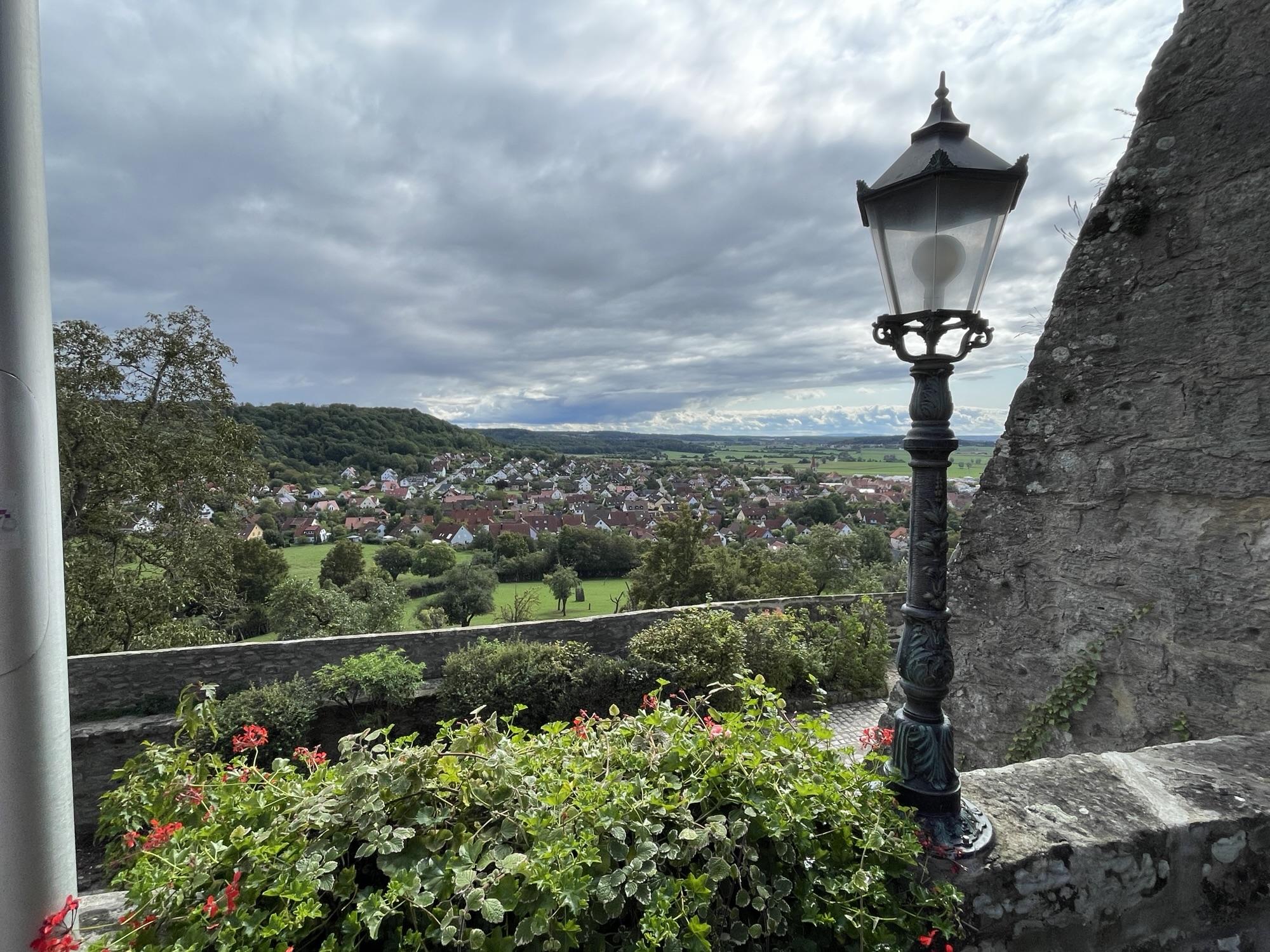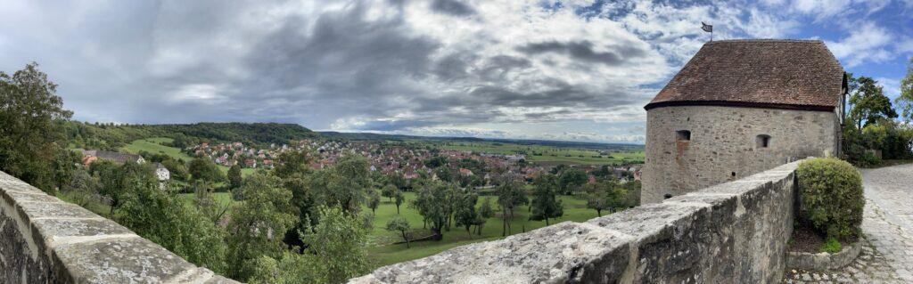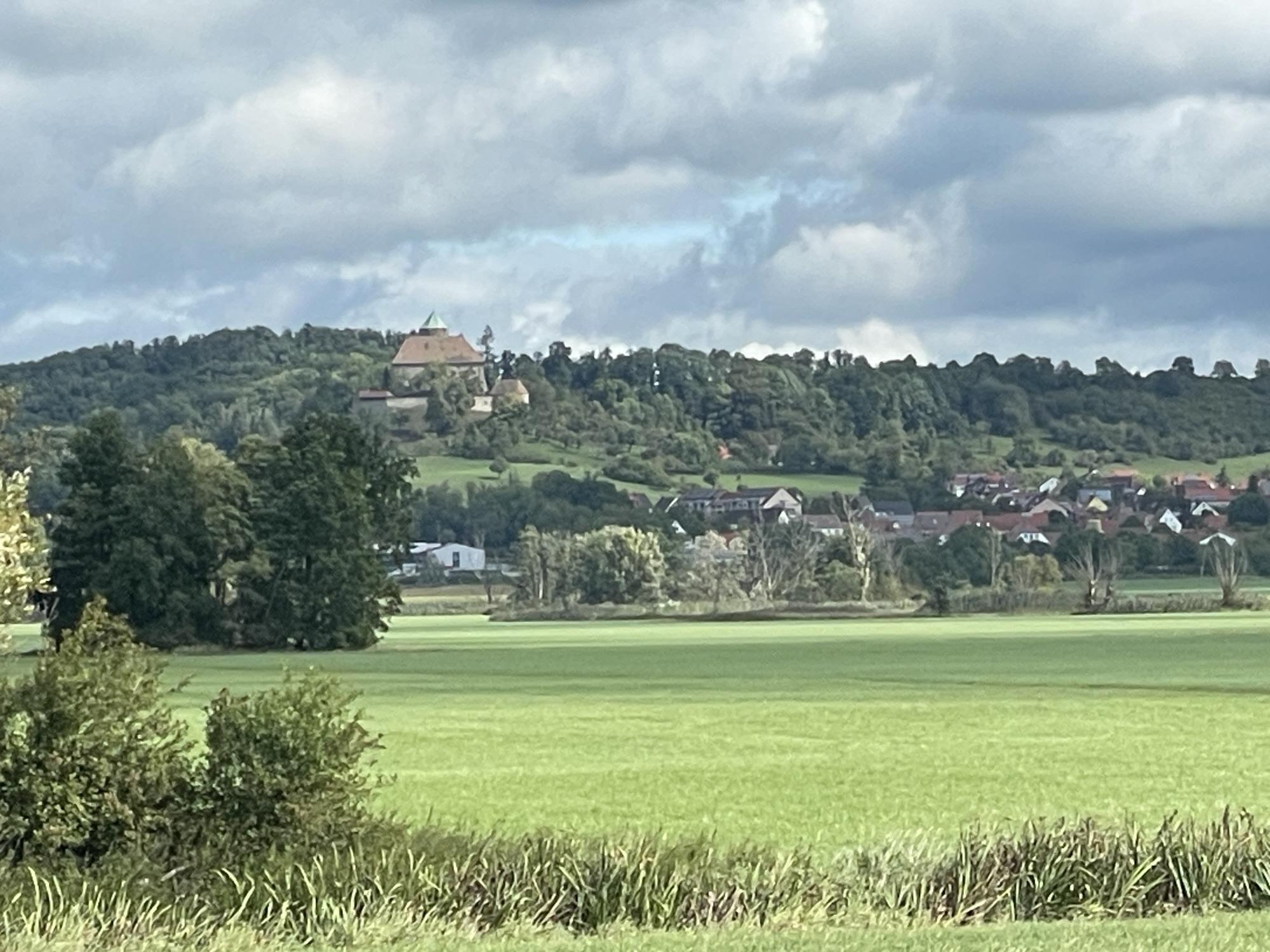 Na zo’n 12 km zijn we even gestopt. De weg was afgesloten wegens wegwerkzaamheden, maar gelukkig konden we er langs. In Buch am Wald hebben we even een bankje opgezocht. Daarna volgde Colmberg, waar we bij de Tourismus Service geïnformeerd hebben waar we in Colmberg een hapje konden eten. De enige mogelijkheid op dat moment was bij het hotel-restaurant bij de Burcht van Colmberg. Daar was het prachtig. Mooie uitzichten en heerlijke soep, Frankischer Käse-Wein suppe. We hebben zelfd buiten op het terras gezeten en zo af en toe kwam het zonnetje heerlijk door en was het echt flink warm.