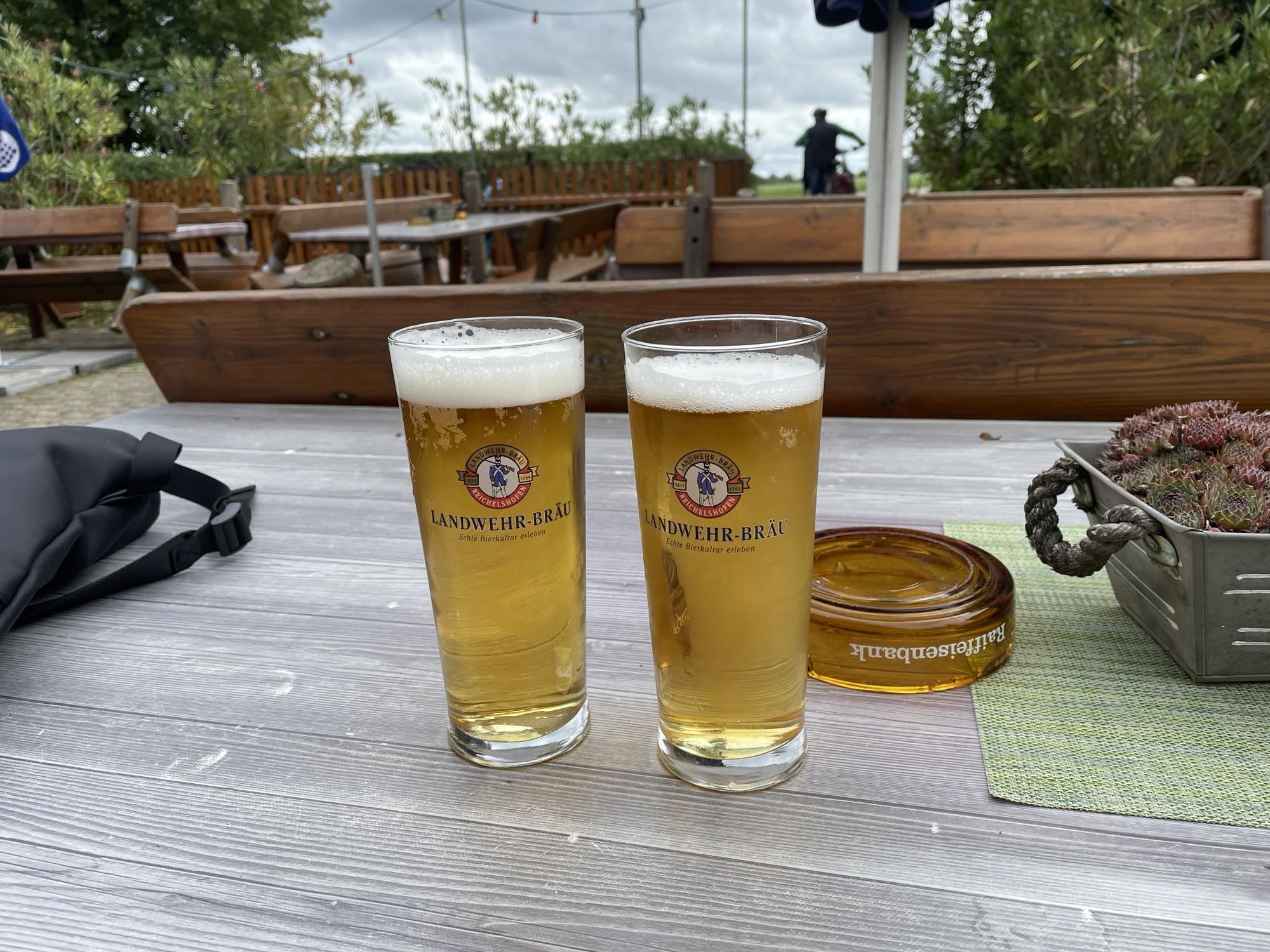 Na de pauze ging de route terug naar Neusitz. Maar wel met forse wind tegen en af en toe een nare miezerbui. In Hornau kwamen we langs een biergarten, “Zur Altmühlquelle”, waar we een Radler dronken, 0,25 cl Sprite en 0,25 cl bier van de tap. Dus een hele echte Radler zoals die bedoeld is.